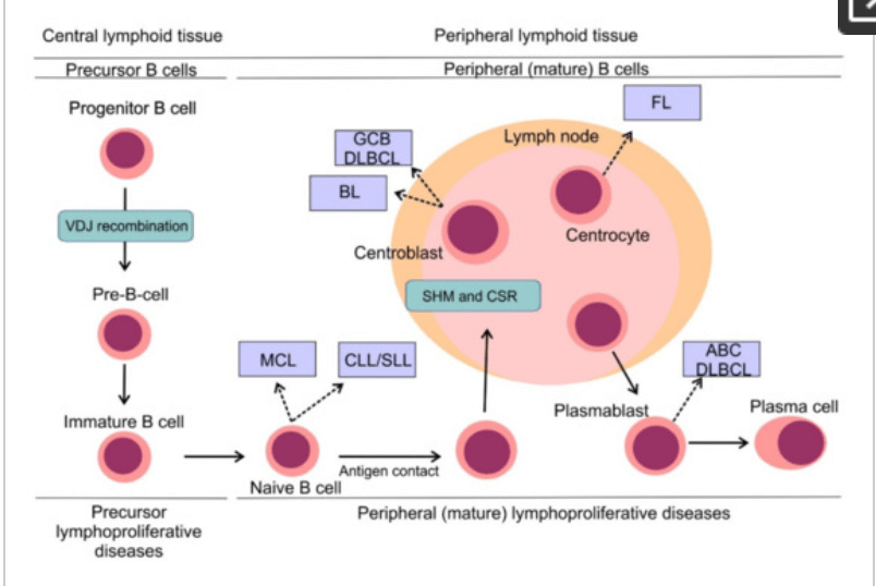 Figure from MDPI depicting the B-cell’s transformation process in those with MCL